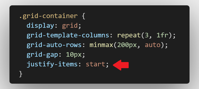 Aligns grid items along the inline (row) axis. This value applies to all grid items inside the container. justify-items are applied to the grid container and support the following values: