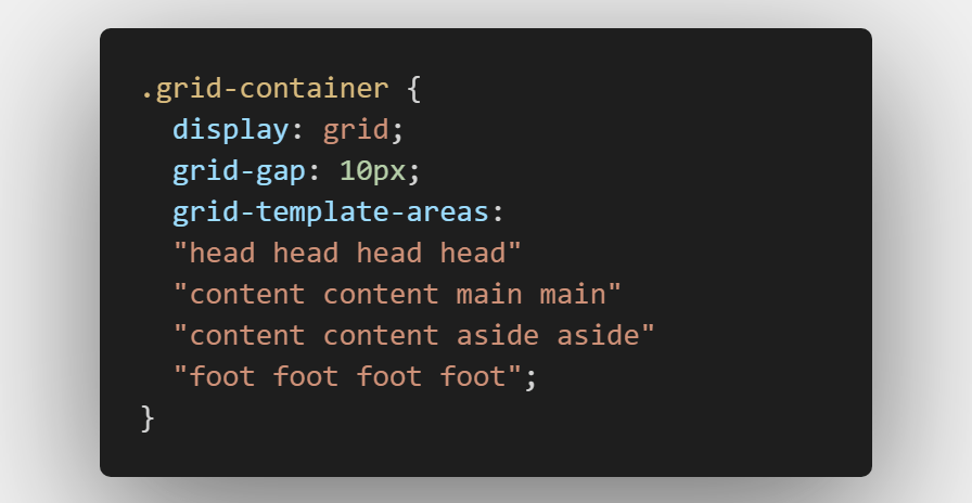 grid areas can be named with the grid-template-areas property. Names can then be referenced to position grid items.