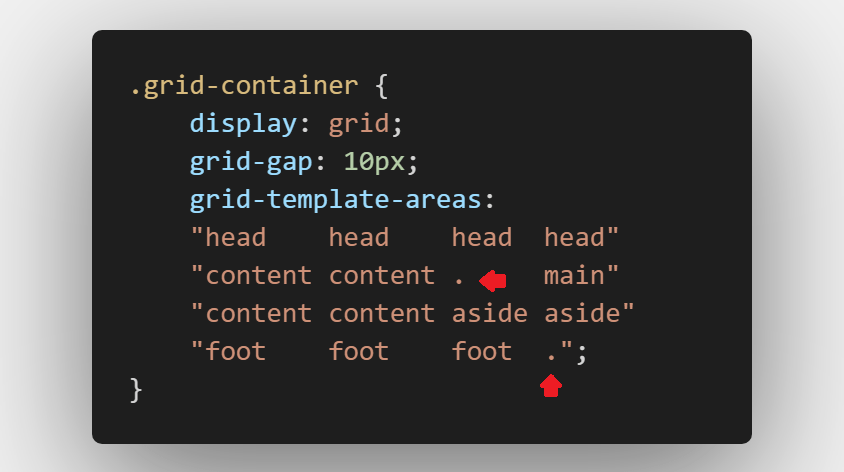 We have completely filled our grid with areas in that 👆 example, leaving no white space. However you can leave grid cells empty with this method of layout. To leave a cell empty use the full stop / period character, ..