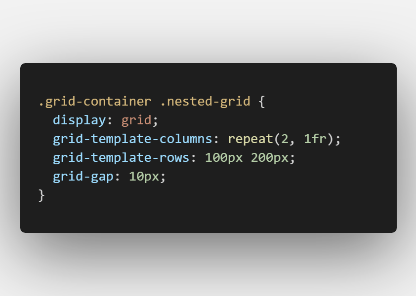 so, we have to give the div with class nested grid a display: grid, because it becomes the parent element for the paragraph elements and you can set the css grid properties we learned above to create the grid like that: